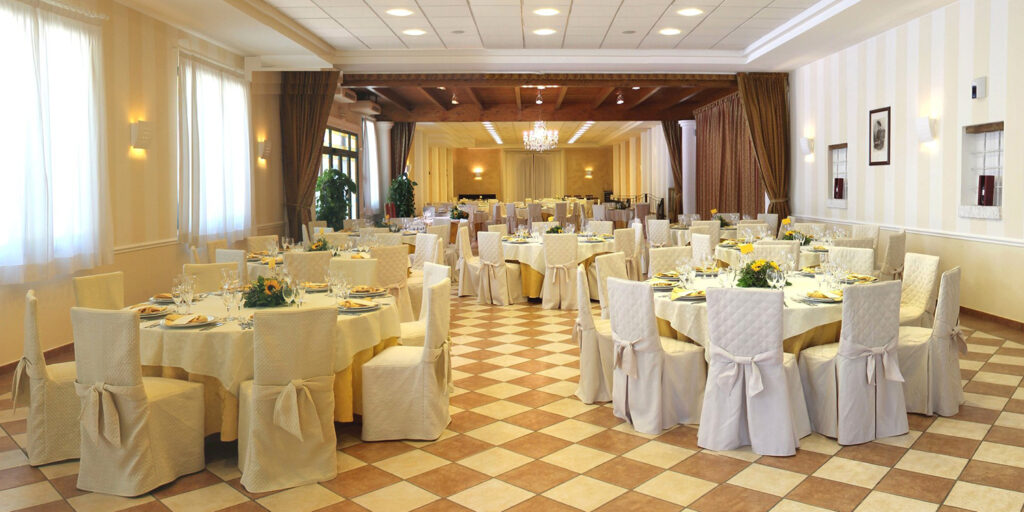 Le sale interne — dalla Sala Principale con i suoi 400 posti alla più raccolta Sala dell’Affresco, fino alle intime Sala del Camino e Sala della Villa — permettono allestimenti dinamici e su misura.