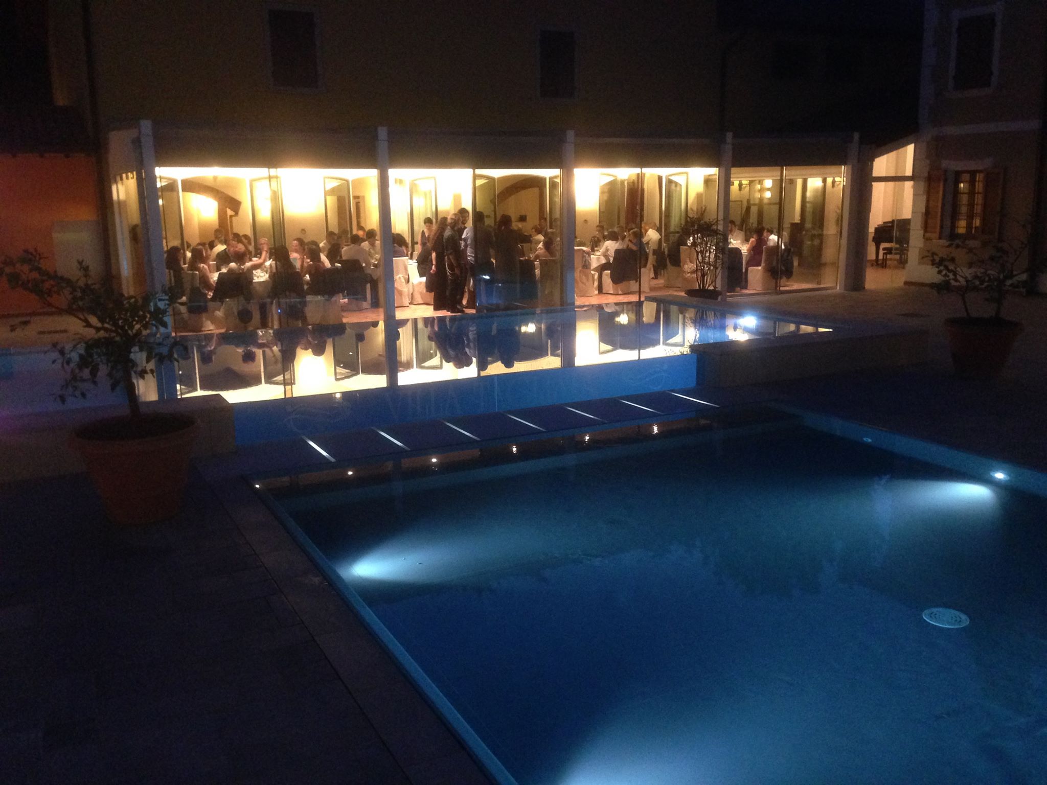 L’ampio parco di diecimila metri quadrati e la zona piscina sono ideali per aperitivi aziendali, presentazioni informali o momenti di networking all’aperto.
