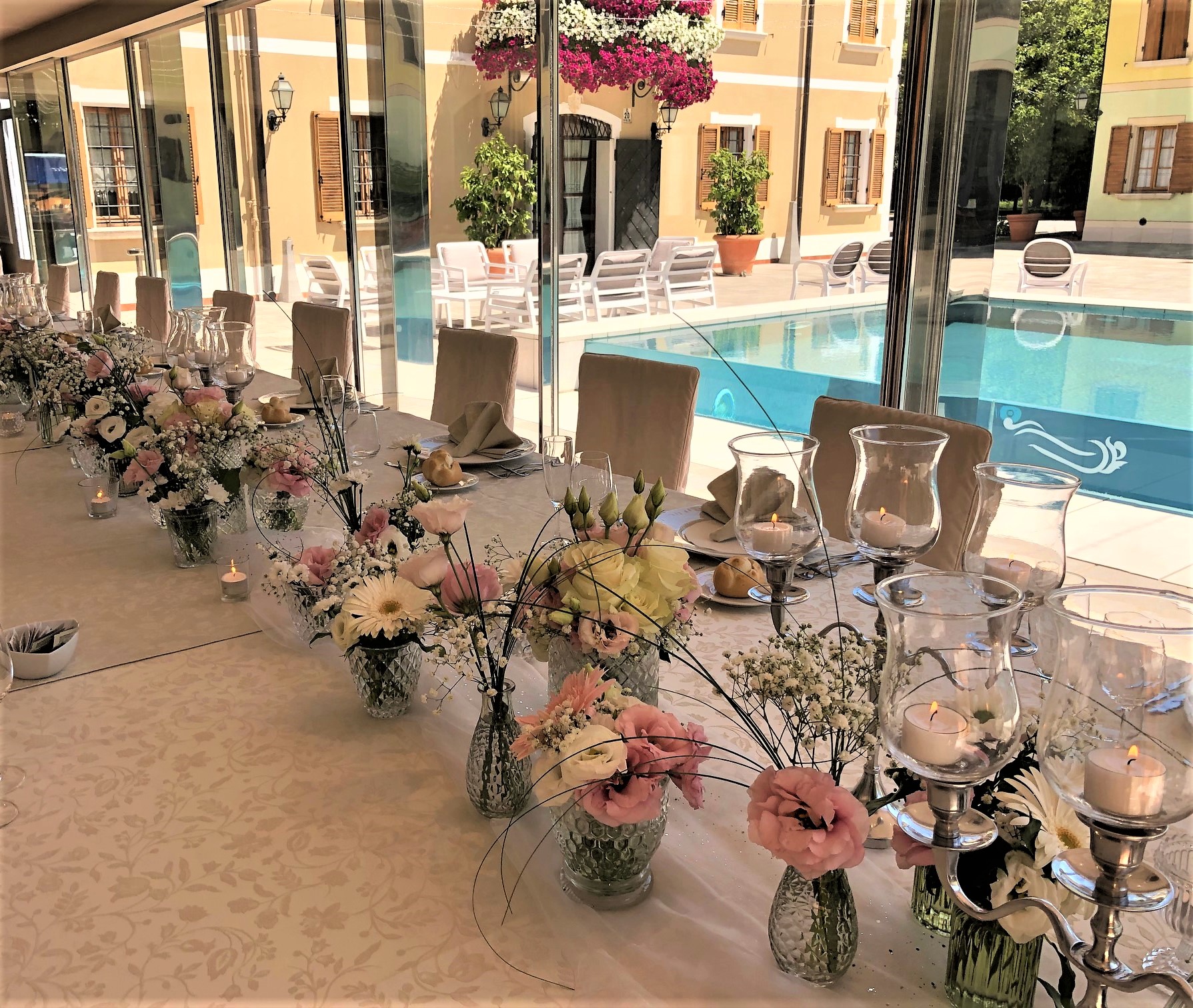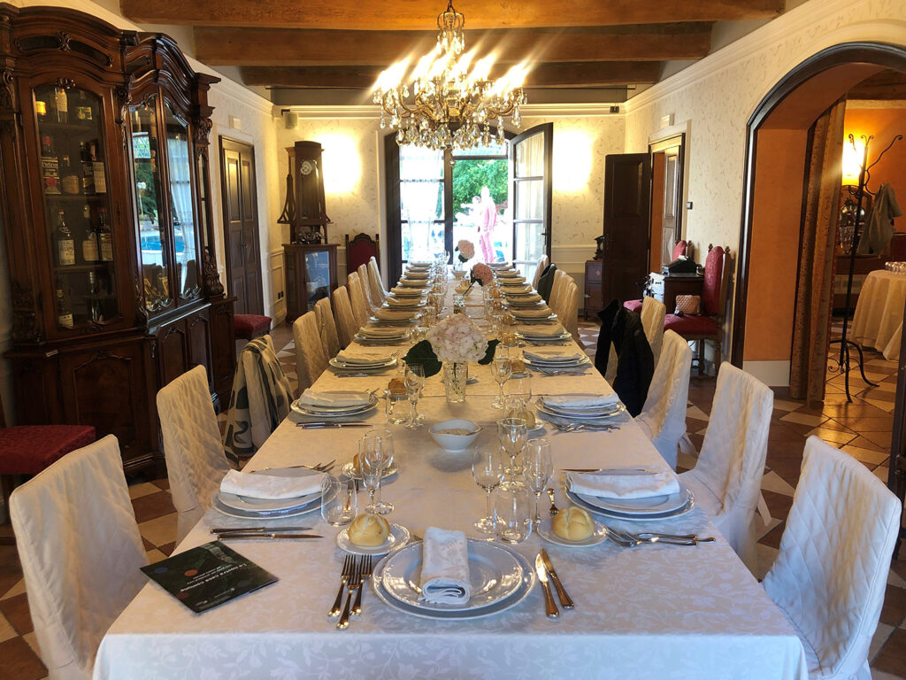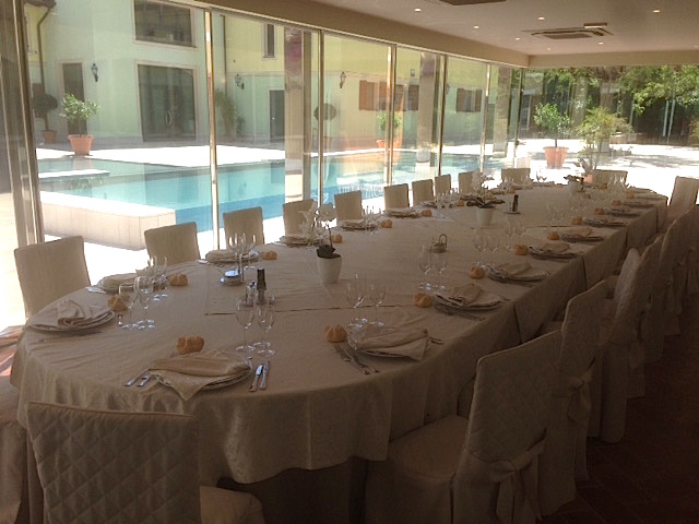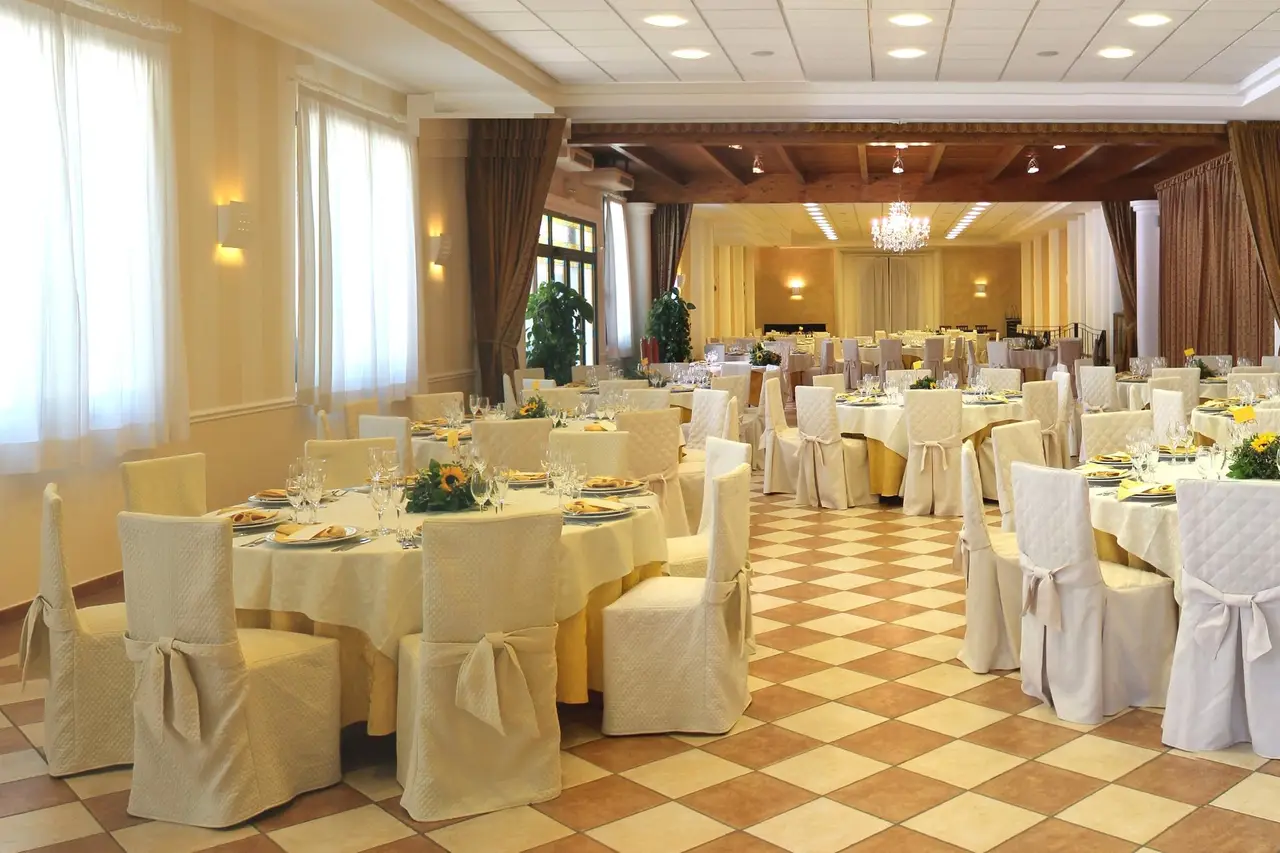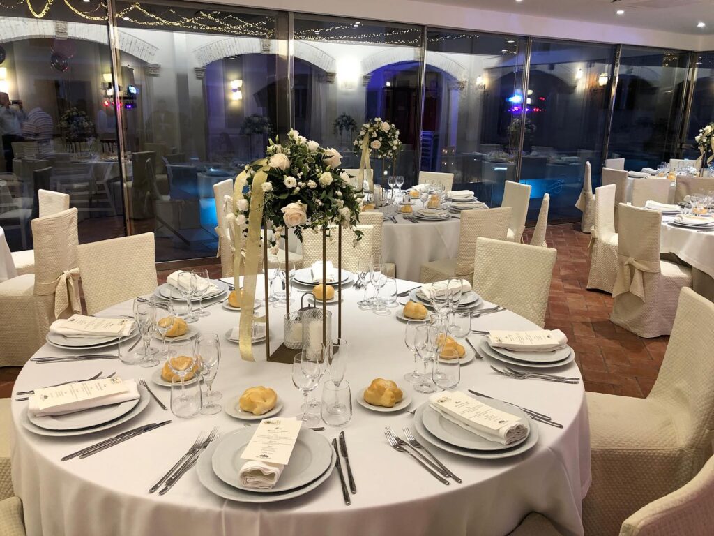 Immaginate un brindisi al tramonto a bordo piscina, un buffet nel parco tra luci sospese e musica dal vivo, o una lunga tavolata sotto le volte della Sala dell’Affresco, con i profumi della cucina che si intrecciano alle risate degli ospiti.